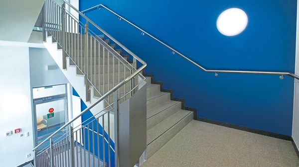 Wenn der Patient in seinem Bett liegt, schaut er auf Himmel und Wolken sowie auf ineinanderlaufende Blau-Weiß-Formationen, die das Malerteam um Malermeister Sven Hülsmann mit einer speziellen Wischtechnik an die Decke aufgetragen hat. Kontrastreich wurden die Seitenwände zum Teil mit hellgelbem Herbol-Decorlack gestaltet. Dazu strahlen Wandleuchten aus türkisfarbenem Stahl ihr weiches Licht dezent nach oben. Auch die blauen Sitzmöbel fügen sich in das harmonische Bild. Überhaupt: Blau spielt eine zentrale Rolle. Im Treppenhaus leuchtet der Mond auf ultramarin beschichteten Wänden in Form von scheibenförmigen Wandleuchten. Die Treppengeländer aus gebürstetem Edelstahl schaffen dazu einen reizvollen Tonwert-Kontrast.