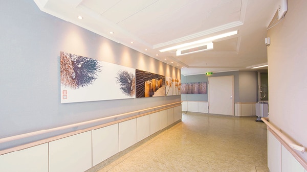 Dazu Herr Paulus: „Weil die Klinik sehr beliebt und daher auch immer gut belegt ist, konnten wir immer nur ein bis zwei Zimmer pro Tag streichen. Nach dem Wandanstrich wurden die Böden dann nochmal extra desinfiziert.“ Auf den Fluren erblühte das Konzept von Frau Leiser erst richtig: Alle Etagen sind farblich anders gestaltet, alle sind nun individuell und ausgefallen, mit geschmackvollen Möbeln und Bildern ausstaffiert. Hier kam Herbol Zenit PU 10 zum Einsatz, das seidenmatte PU-Wandfinish, das dank ähnlicher Eigenschaften wie Herbol Zenit PU 30 leicht zu verarbeiten ist und dabei spielend alle Hygienestandards erfüllt.